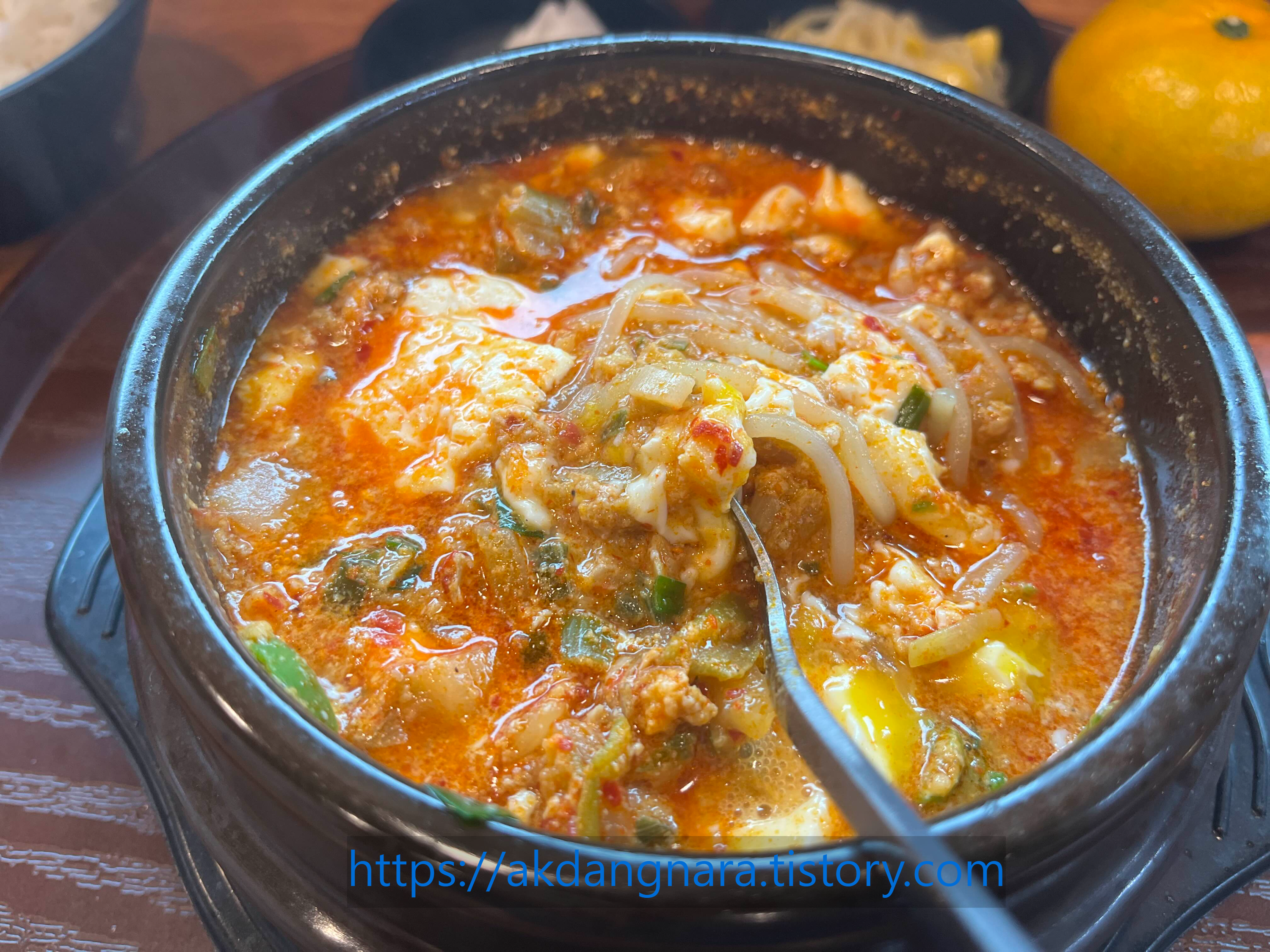 국물은 얼큰한 순두부의 맛보다는 빨간 국물의 만둣국처럼 고기 국물맛이 진했고,