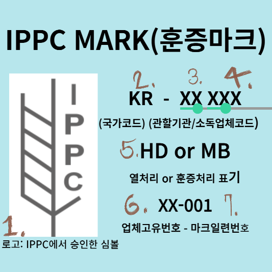 IPPC MARK 는 훈증마크를 나타내며, 파렛트에 표기가 되었다는 건 소독처리가 완료가 되었다는 표시입니다. 위의 그림을 보시면 1) 훈증마크의 경우 왼쪽에 IPPC 로고가 쓰여 있으며, 2) 옆에 KR은 ISO의 국가코드를 말하며 2글자로 우리나라의 경우 KOREA지만 KR로 줄여서 말합니다. 3) 옆에 숫자는 5자리로 앞의 2자리는 훈증 마크를 발급한 지역본부 기관 번호를 말하며, 4) 뒷자리 3자리는 소독업체코드를 말합니다.