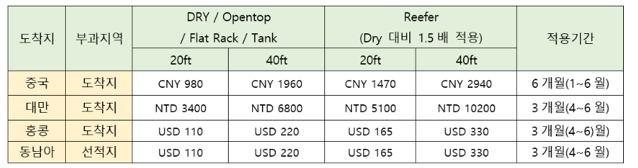 수입자쪽에서 수출자가 내는게 아니냐고 반박하는 경우가 많다고 합니다. 부과지역의 경우는 위의 사항처럼 정해져 있지만, SHIPPER와 CNEE가 합의가 되어 수출자쪽에서 지불가능하며, 선사에 따라 다를 수 있기 때문에 부과되는 지역과 다르게 지불방법이 다른 경우는 미리 선사쪽에 확인하고 처리하시는게 좋습니다.