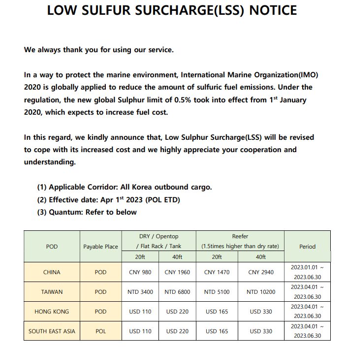 LSS비용은 저유황 할증료로 LOW SULFUR SURCHARGE, 모든 운항 선박에 사용되는 연료유의 황함유량을 3.5%에서 0.5%로 낮춘 고가의 저유황유 사용하는 의무에 따라 선박연료의 상승으로 인하여 국제 연료 시장 가격에 연동하여 LSS를 적용해 오고 있습니다. 2023.2분기(4월 ~6월)에 LSS 조정된 단가 안내해드립니다.