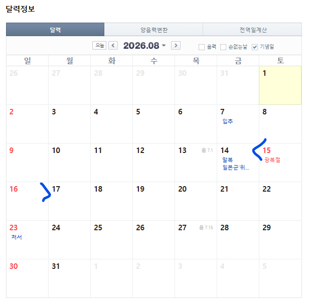 8월 15일  토요일이라 대체 휴무일이 있을 것 같은데 아직 네이버에는 표시가 안되어 있네요.