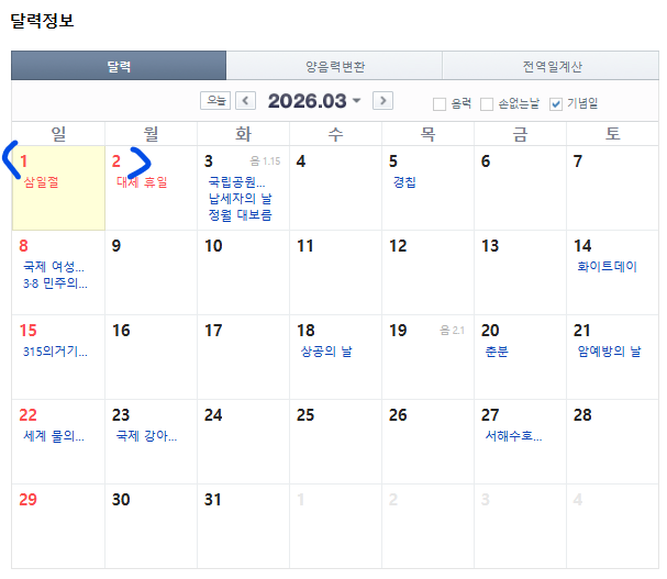 새 달력을 보면 가장 먼저 보이는게 휴일 챙기기인거 아시죠?
